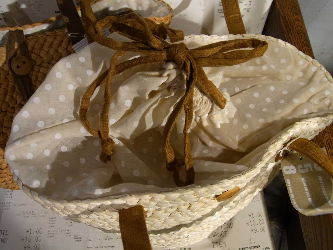 COM:持ち手がスエードになりました^^ボタンをひっかけてとめるタイプで中にも水玉のふくろが~♪